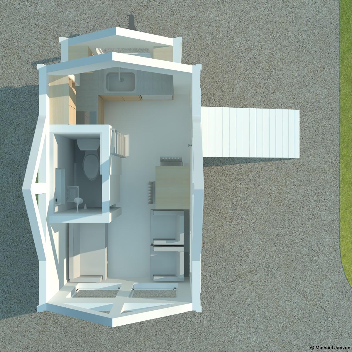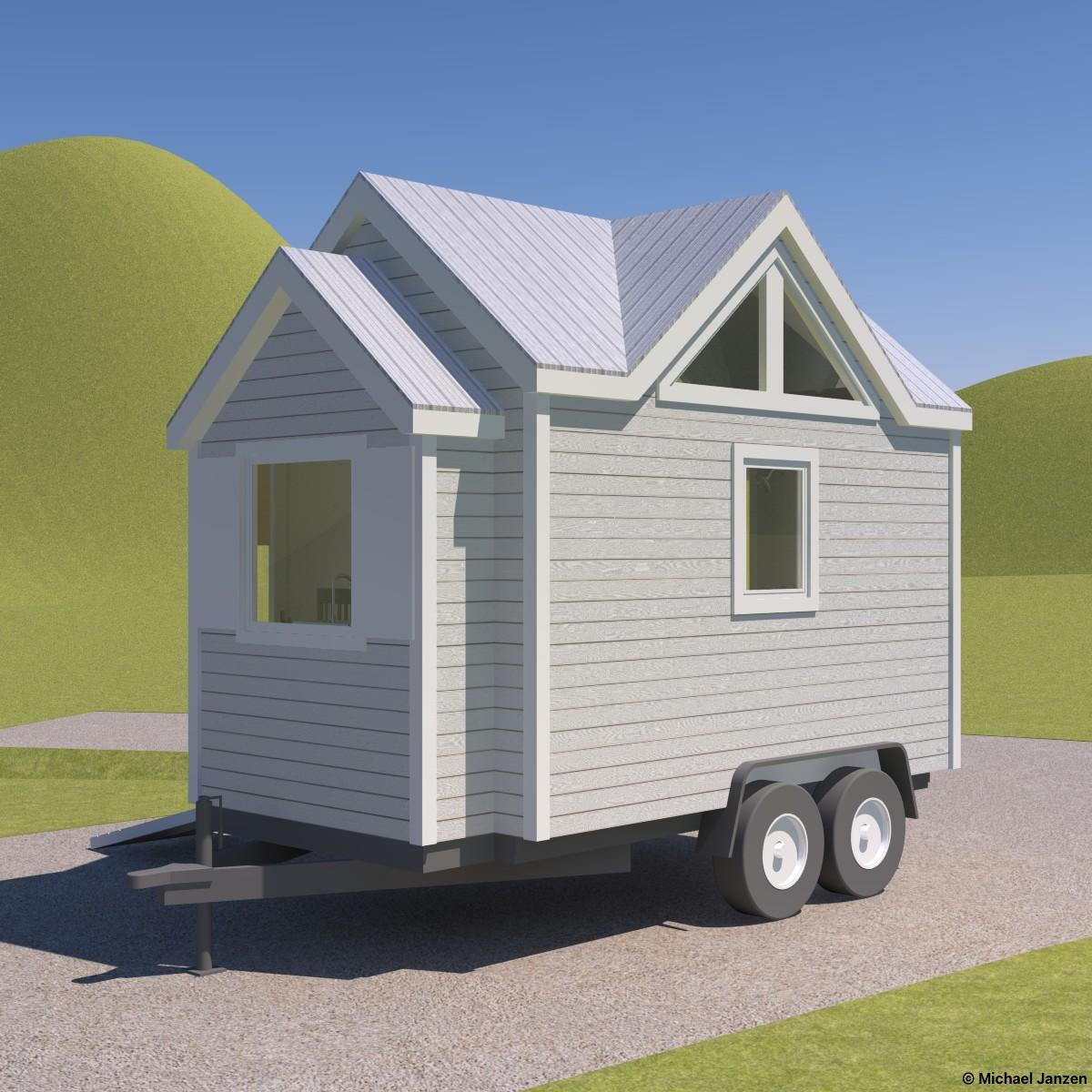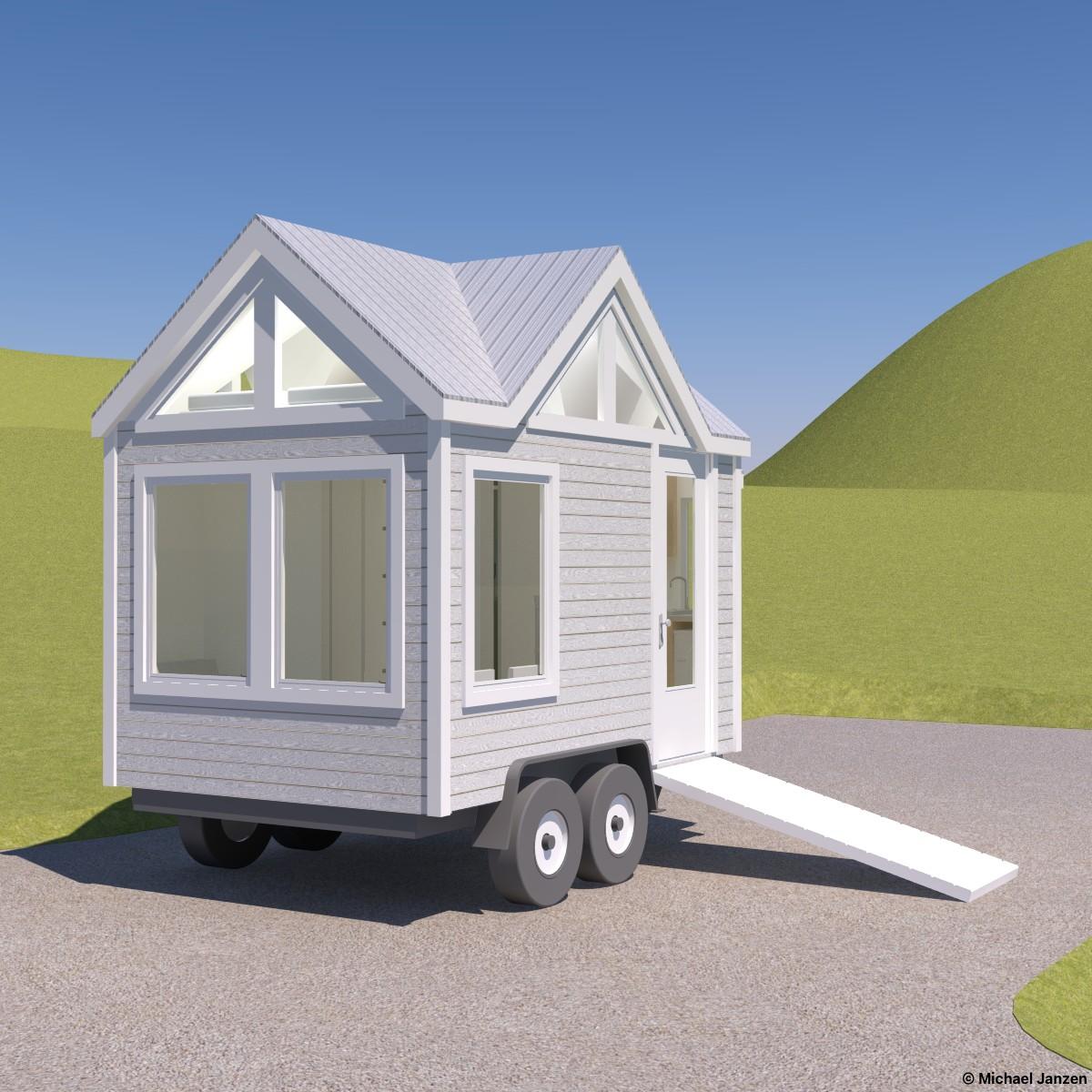 A 10/12 cross-gable roof with large windows and a side entry. A fold-up ramp would provide easy access. Inside is a tiny wet bathroom with a shower, toilet, and tiny wall-mounted sink. The kitchen extends over the trailer tongue in a bump-out and has the basics: a sink, a small refrigerator, a small cooktop, and storage. Also, space for a small chair, a loveseat, and a desk is on the lower level. The loft has room for a queen bed and is accessed by wall-mounted ladder rungs.