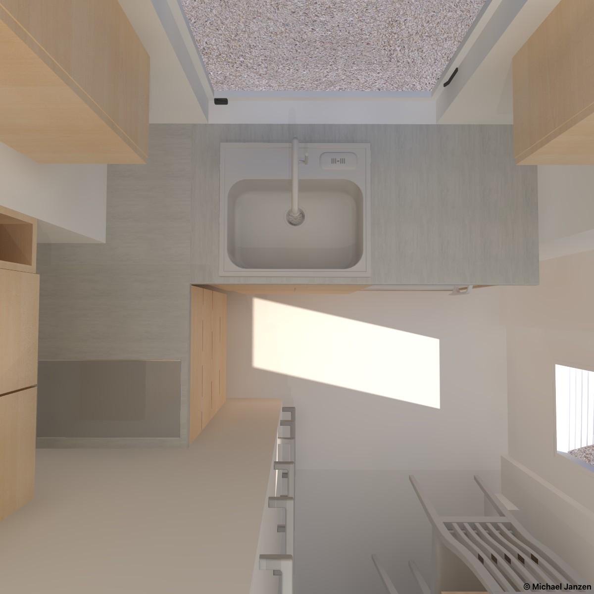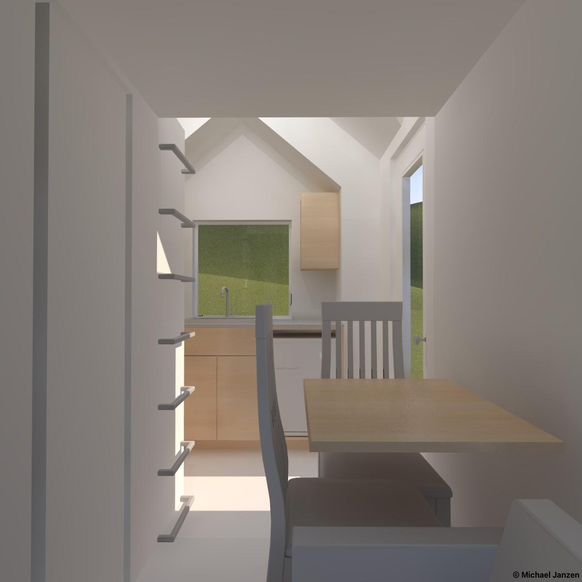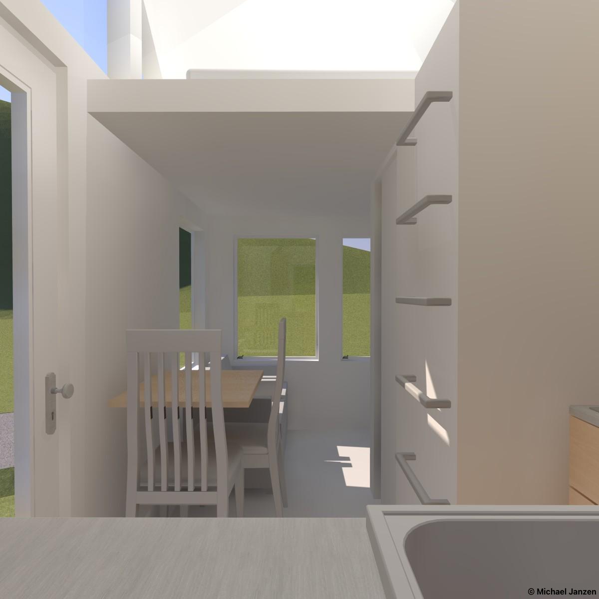 A 10/12 cross-gable roof with large windows and a side entry. A fold-up ramp would provide easy access. Inside is a tiny wet bathroom with a shower, toilet, and tiny wall-mounted sink. The kitchen extends over the trailer tongue in a bump-out and has the basics: a sink, a small refrigerator, a small cooktop, and storage. Also, space for a small chair, a loveseat, and a desk is on the lower level. The loft has room for a queen bed and is accessed by wall-mounted ladder rungs.