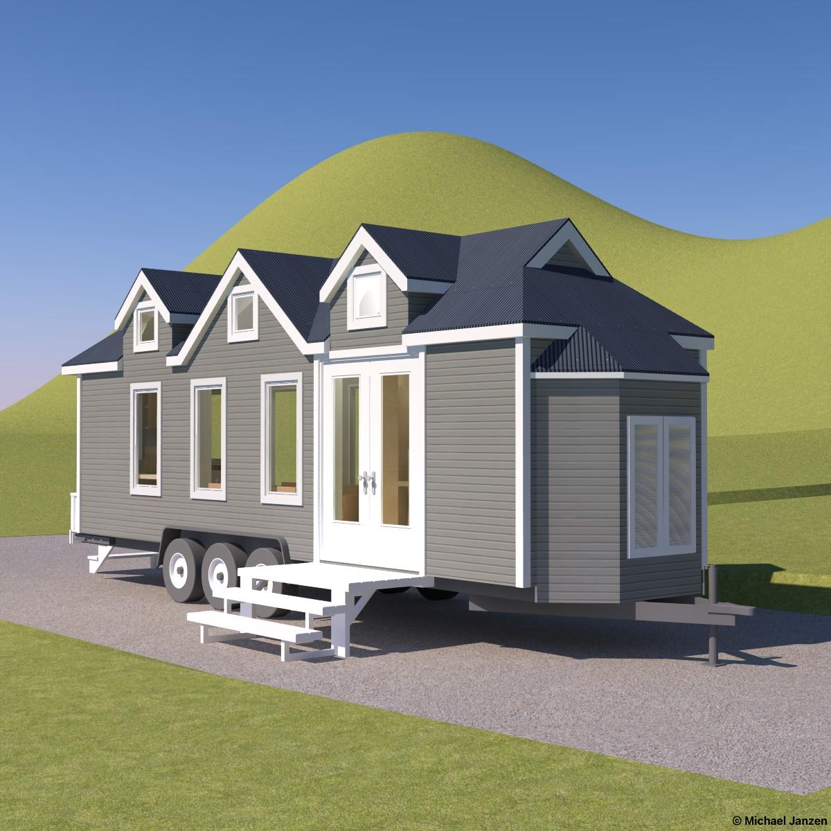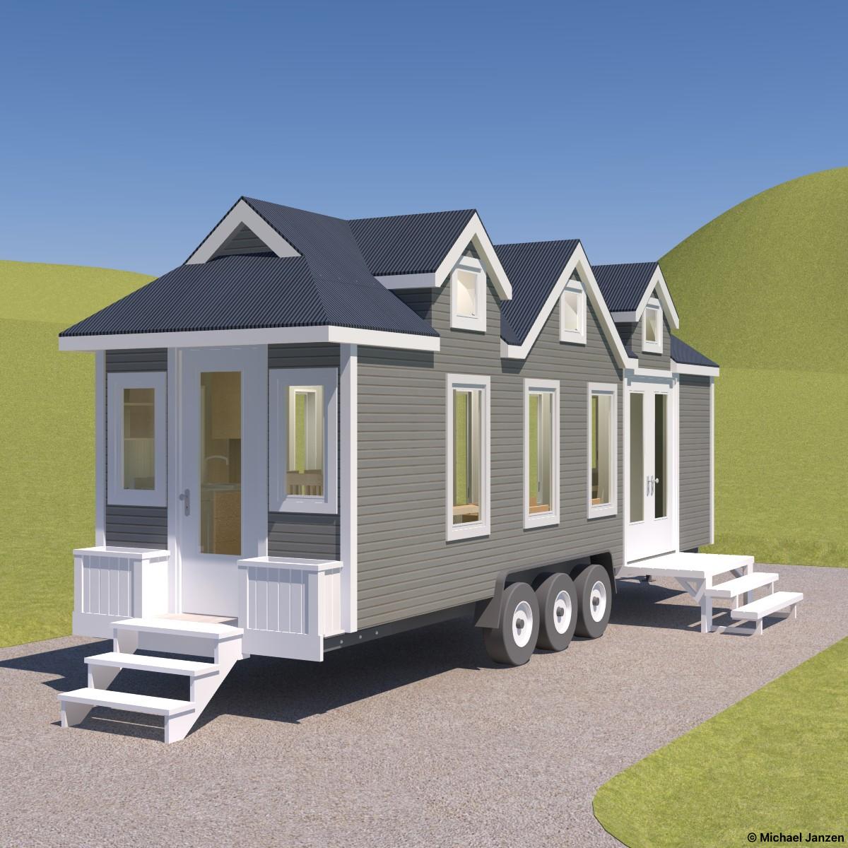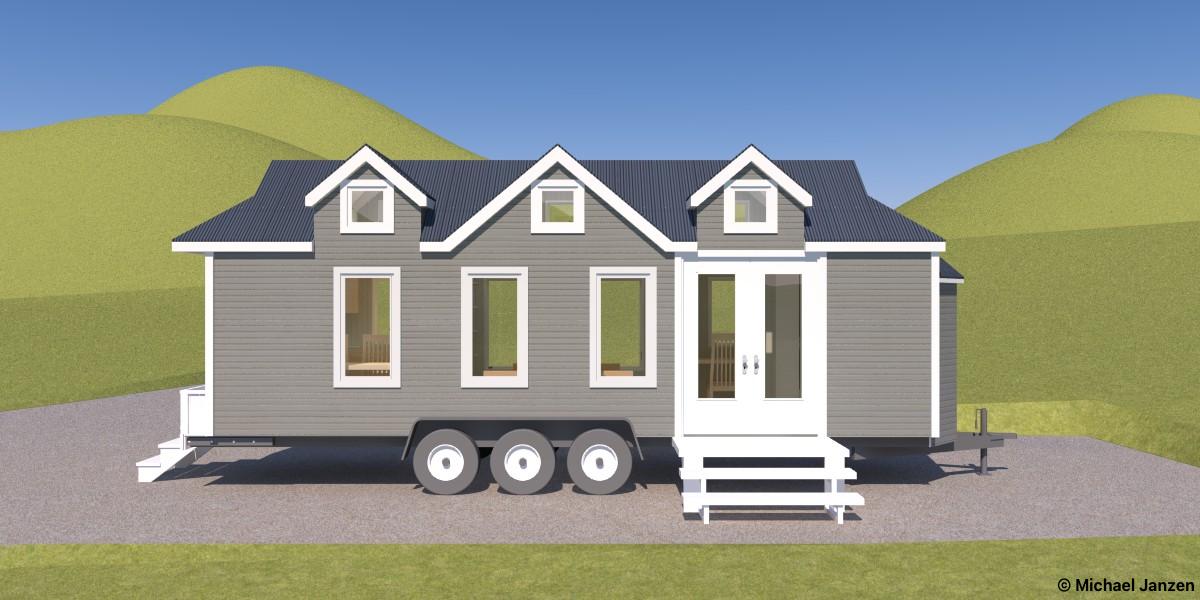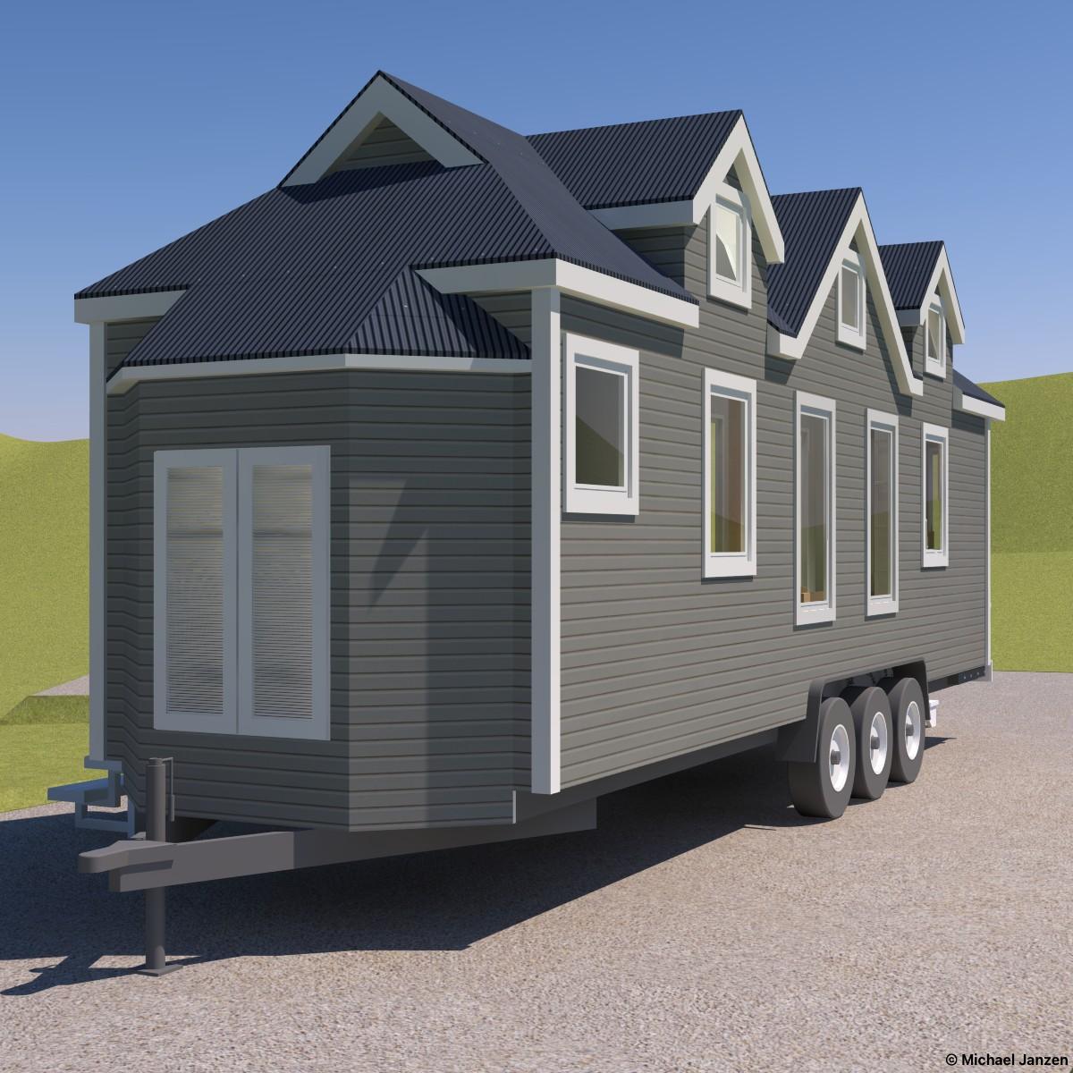 The structure is defined by a complex 10/12 pitch Dutch gable roof, punctuated by dormers and a transverse center gable. An integrated utility shed at the trailer tongue follows the primary roofline, optimizing the aerodynamic profile for transport.