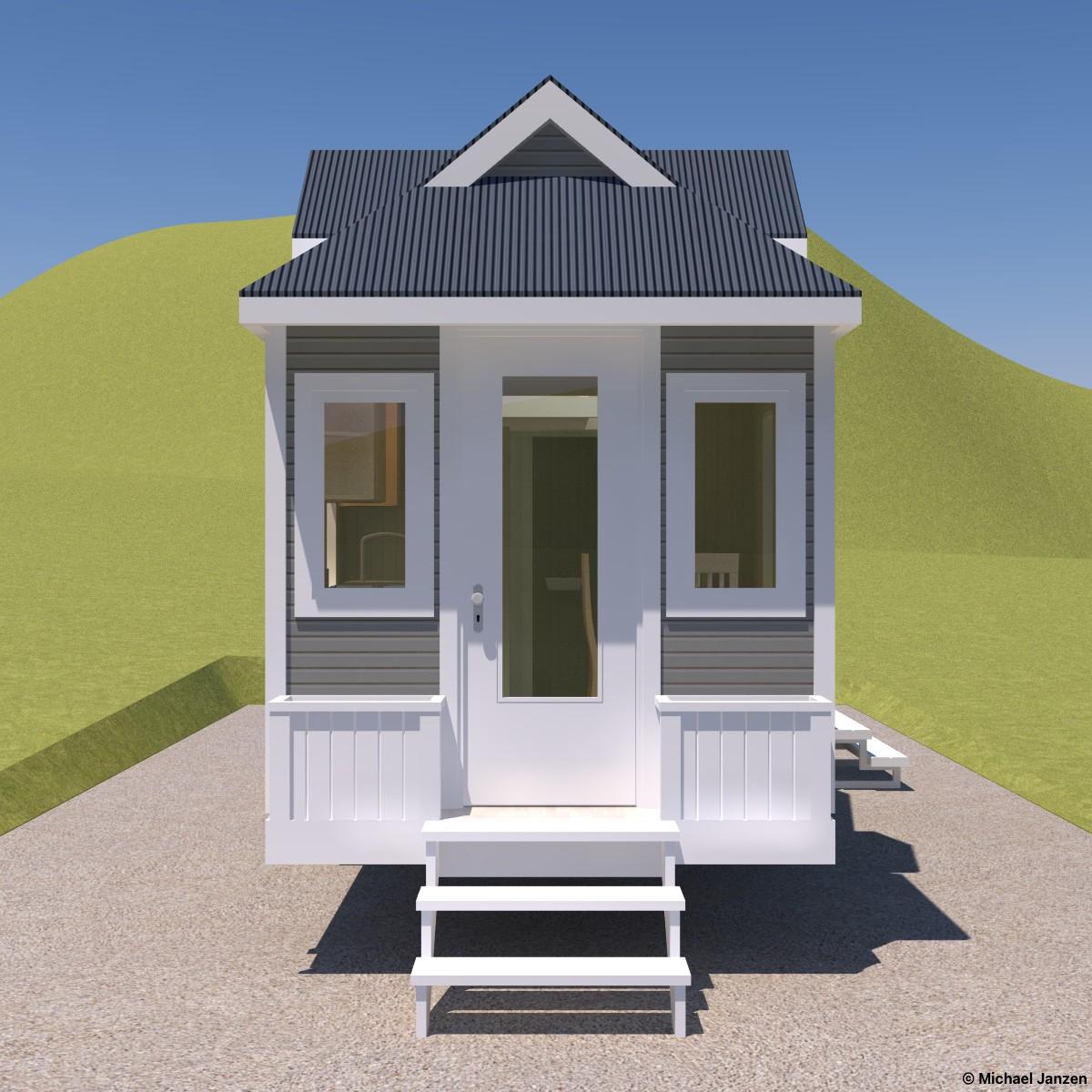 The entry elevation features a recessed wall plane, providing a protective overhang and accommodating bilateral planter boxes. The floor plan initiates with the kitchen and a four-person dining area, separated from the living room by a partial partition. Vertical circulation to the dual lofts is provided by interior wall-mounted ladders within the living zone. The rear program consists of a home office alcove, laundry closet, full bath, and French doors.