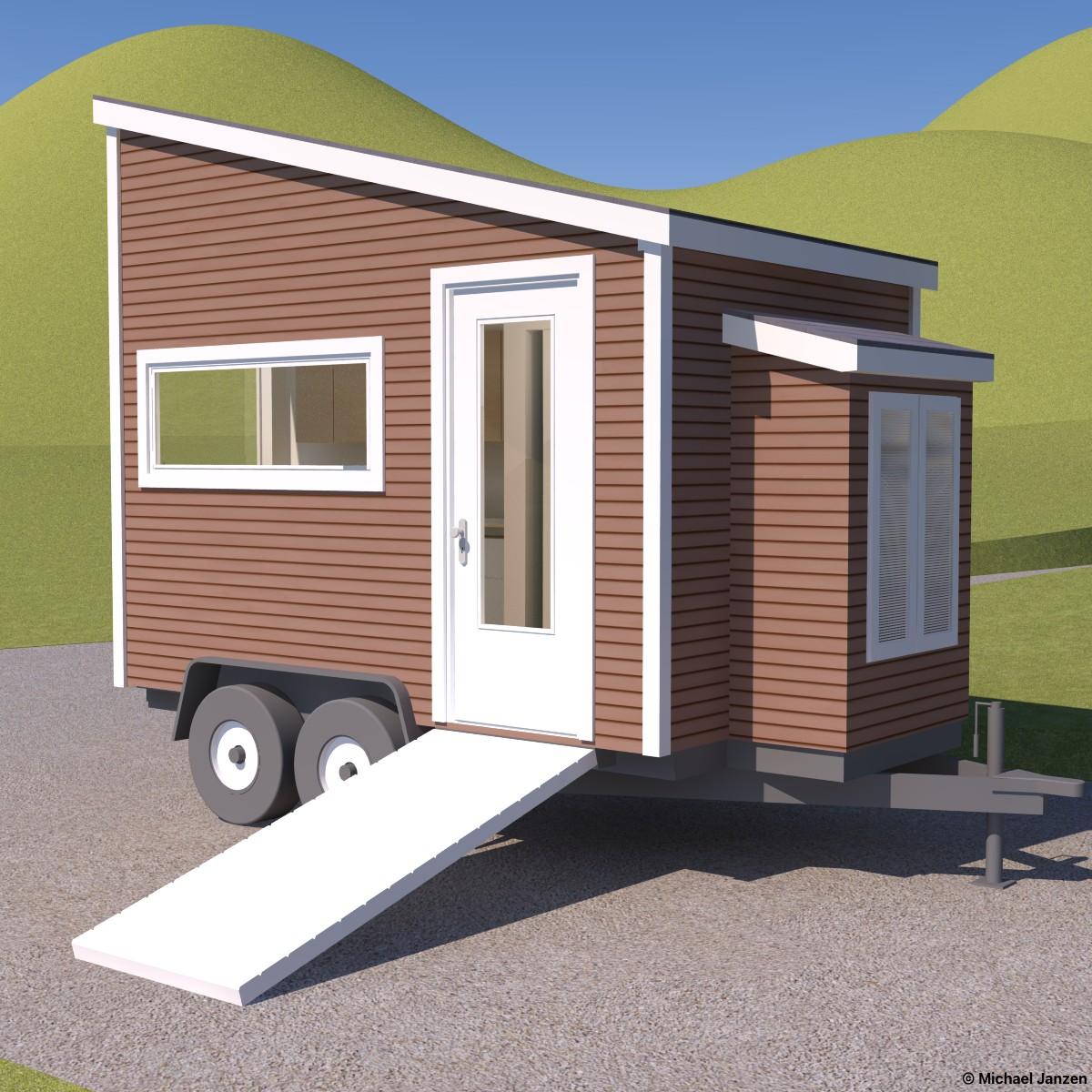 The wedge shape of this tiny house would make it more aerodynamic than most tiny homes. A fold-up ramp on the side would provide easy access. The most notable feature after the geometric shape is the giant picture window. Inside you’ll find a tiny wet bathroom with a shower, toilet, and tiny wall-mounted sink. The kitchen has the basics: a sink with a drain rack cabinet above, a small refrigerator, a small cooktop, and storage. Also, on the lower level is space for two small comfy chairs and a desk. The loft has room for a queen bed and is accessed by a fixed vertical ladder inside the entry.